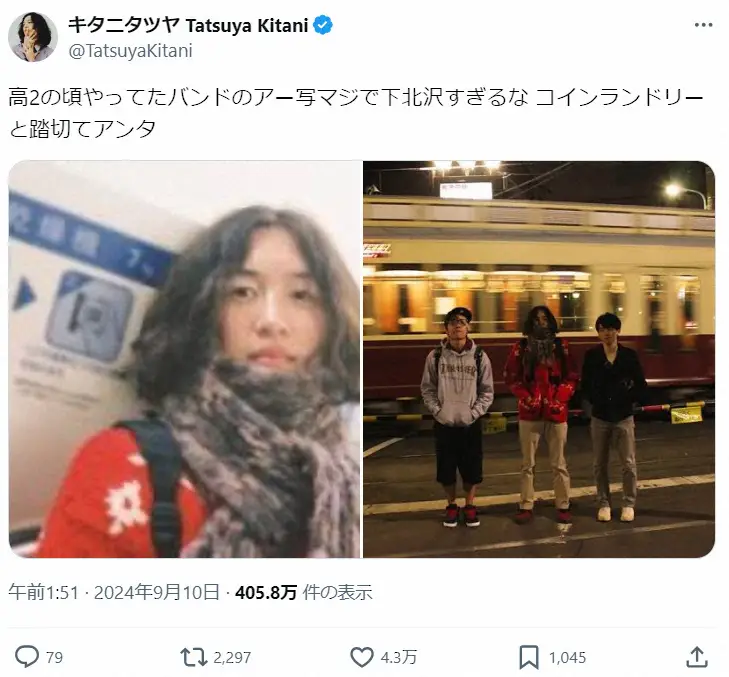 キタニは10日、「高2の頃やってたバンドのアー写マジで下北沢すぎるな コインランドリーと踏切てアンタ」とつづり、高校時代に組んでいたバンドの宣材写真をアップ。メンバー3人で踏切の前にたたずむ写真や、一人で洗濯機によりかかる姿を公開した。