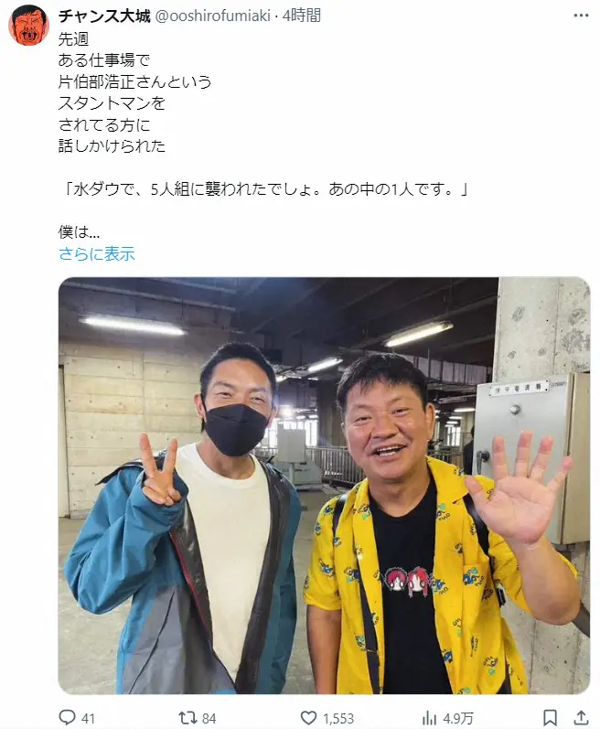 11日放送のTBS「水曜日のダウンタウン」で、暴漢に襲われるドッキリを受けた大城だが、片伯部から「水ダウで、5人組に襲われたでしょ。あの中の1人です」と明かされたという。