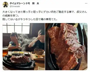 関は「大きくなってきた甥っ子と姪っ子にデカい肉をご馳走する事で、叔父さんの威厳を保つ」と投稿。「隠してはいるがキラキラした目で俺の事見てた」と、肉料理を前に、手で目を隠しながらも笑顔の甥と姪の写真を披露した。