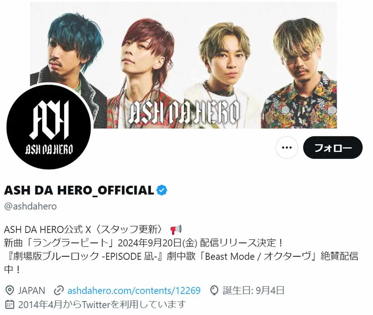 ロックバンド・ASH DA HEROのX(@ashdahero)から