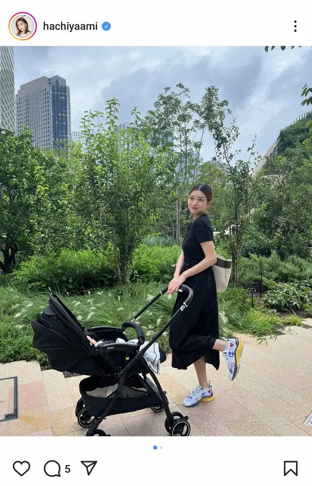 蜂谷の投稿に、フォロワーからは「ママになっても変わらず可愛いです ワンピどちらのですか?」「お綺麗です」「黒コーデに白のスニーカーが映えます」といった反響が寄せられている。