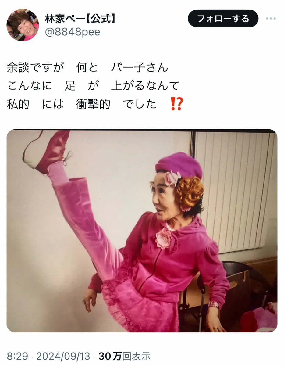 この投稿には「カラダ柔らかい」「すげ~!!!」「わ、若い!」「す、、、すごい!!!!」「素晴らしい股関節ですね」「パー子師匠凄すぎ」「吉川晃司さんぐらい凄い」「シンバルキック出来そう!」「ブルース・リーみたい」「体幹すごいし膝がきれいに伸びてる」などの声が。76歳とは思えないアクロバティックな動きが反響を呼び、1500件以上リポストされた。