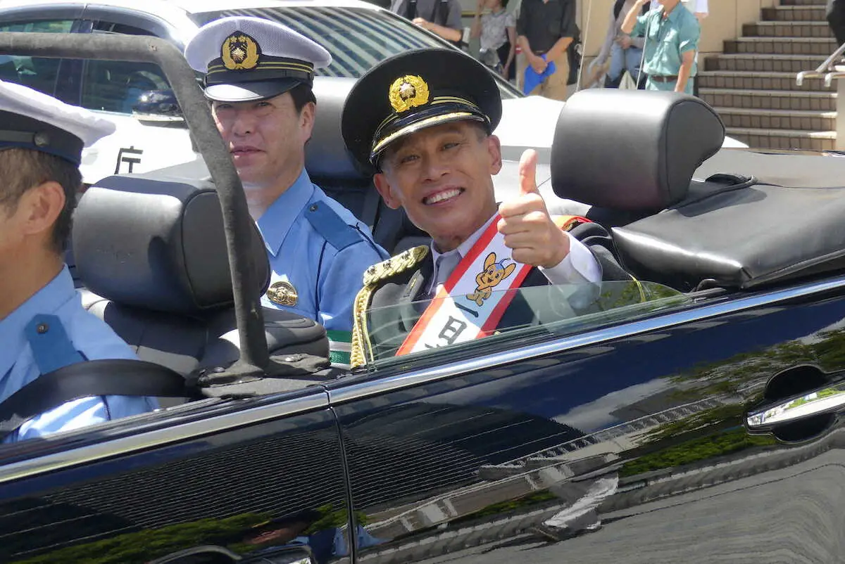 柳沢慎吾 炎天下でオープンカー満喫!? 警視庁高輪署で一日署長 恒例の寸劇も披露