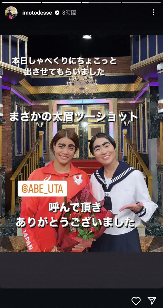ストーリーに「本日しゃべくりにちょこっと出させてもらいました」と書き出すと、太眉にセーラー服姿の自身と、同じ太い眉にジャージ姿の東京五輪柔道女子52キロ級金メダルで、パリ五輪にも出場した阿部詩(パーク24)の2ショットをアップ。
