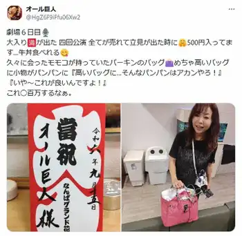 巨人は「劇場6日目」とコメント。「大入りが出た 四回公演 全てが売れて立見が出た時に 500円入ってます…牛丼食べれる」と大入り袋が配られたことを伝えた。