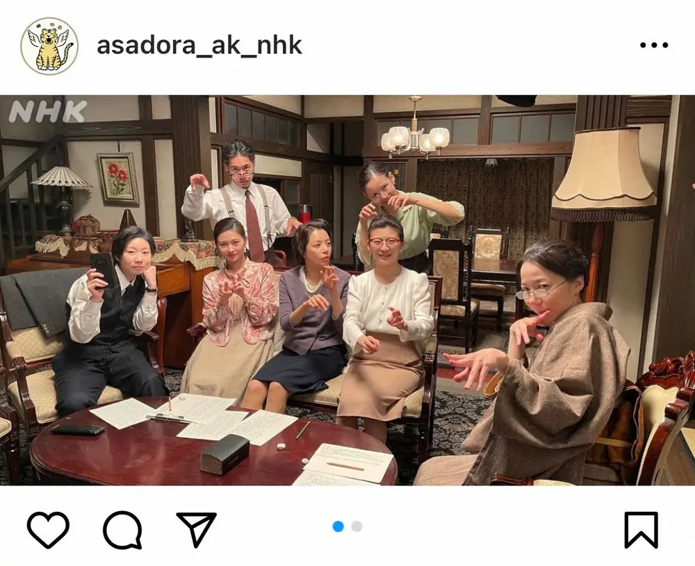 同アカウントは「星家に集まったみんなでパシャリ」とコメントし、歳を重ねたように見える衣装やメイク姿の伊藤や俳優の戸塚純貴などをはじめとする寅子(伊藤)の明律大学時代の同級生を演じたキャストたちのオフショットを公開。