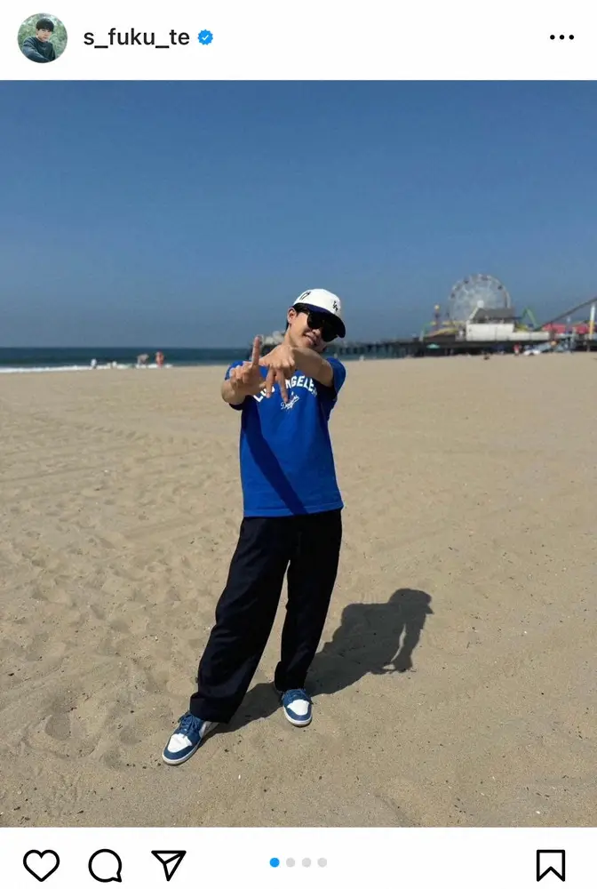 さらに、鈴木はビーチで“LA”ポーズを披露したり、ドジャースのキャップとユニフォーム姿で「ZIP!リアルレビュー」と文字の入った大きなマイクを持った姿やベニスの街中でのオフショットを公開。