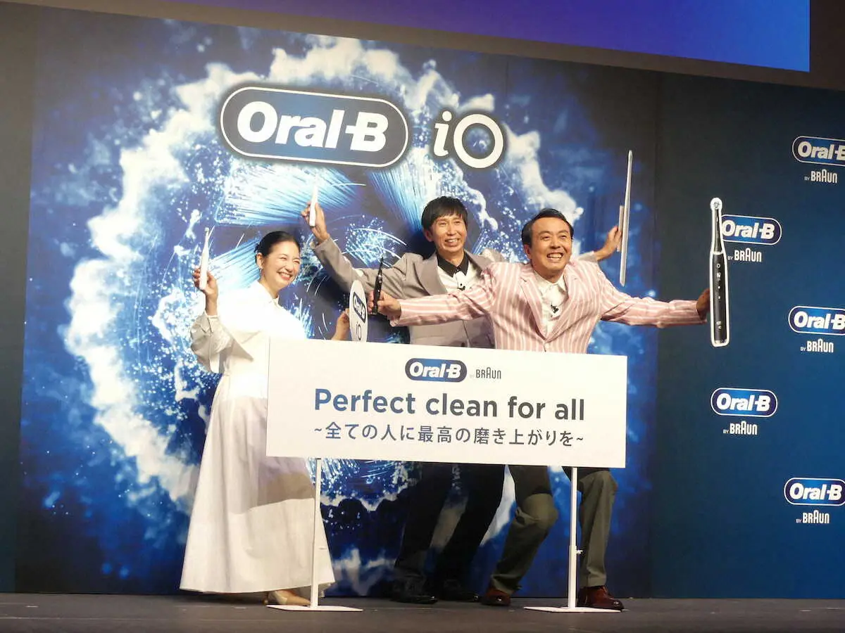 同製品は電動歯ブラシ初心者向けとして開発され、歯垢の除去率で手磨きの約50%から90%以上にアップ(同社比)。「芸能界一歯並びが悪い」と自称する山根良顕(48)は「前歯はずれているし、本数も足りない。磨き残しもあって、歯の間からかめてない米粒がまるまる出てくる」と明かし、「よくイベントに呼んでもらえたな」と苦笑い。