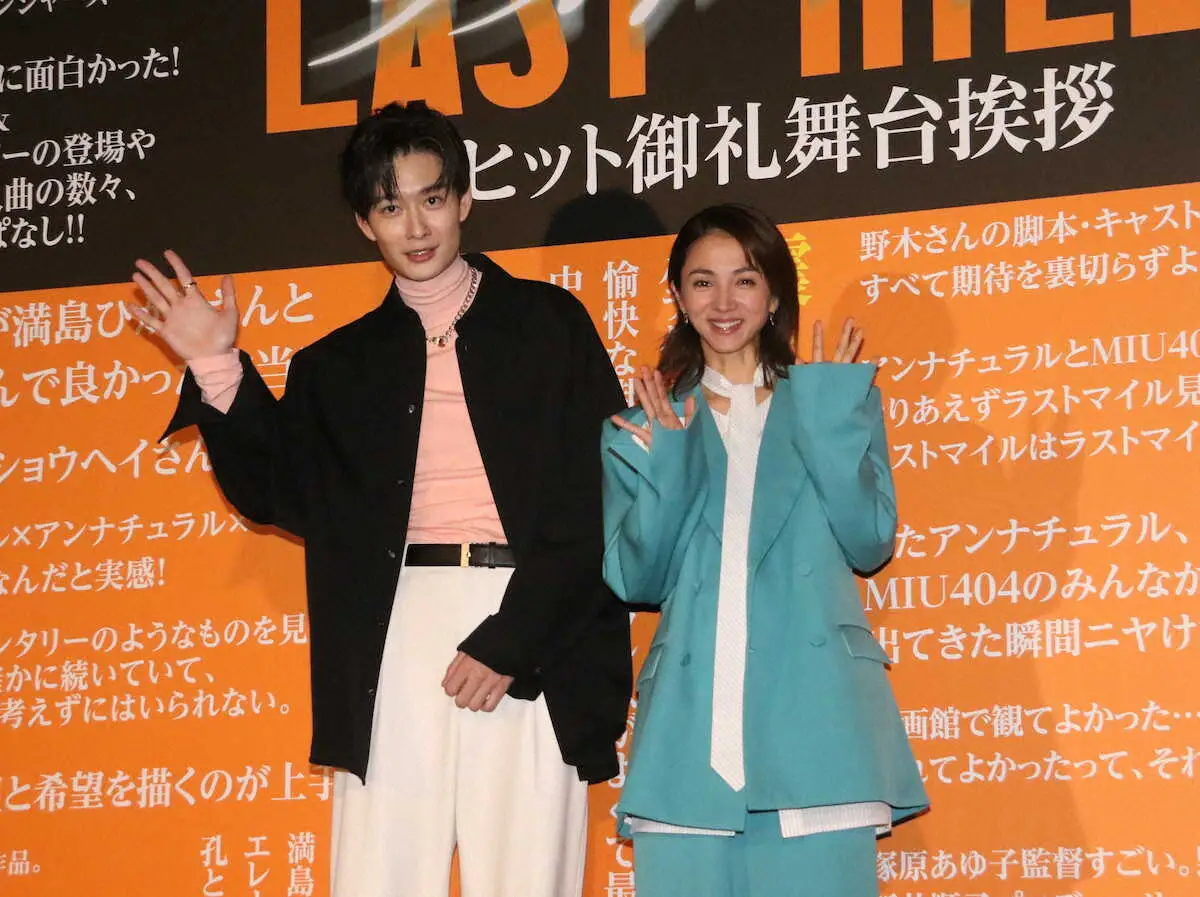 <映画「ラストマイル」大ヒット御礼舞台あいさつ>カメラに手を振る岡田将生、満島ひかり