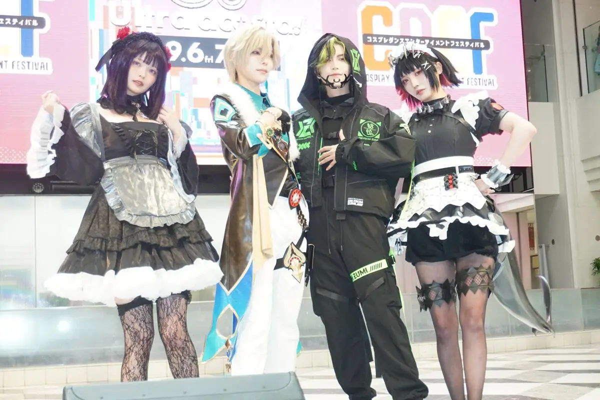 7 日には噴水広場でオープニングセレモニーを実施。いずれも人気コスプレイヤーで池袋コスプレ PR 大使の桃戸もも、ズミ、しょこら、すずらがそろい踏み。SNSの総フォロワー数200万人超を誇る4人の麗しき競演に、客席からはポージングのたびに大歓声が上がった。
