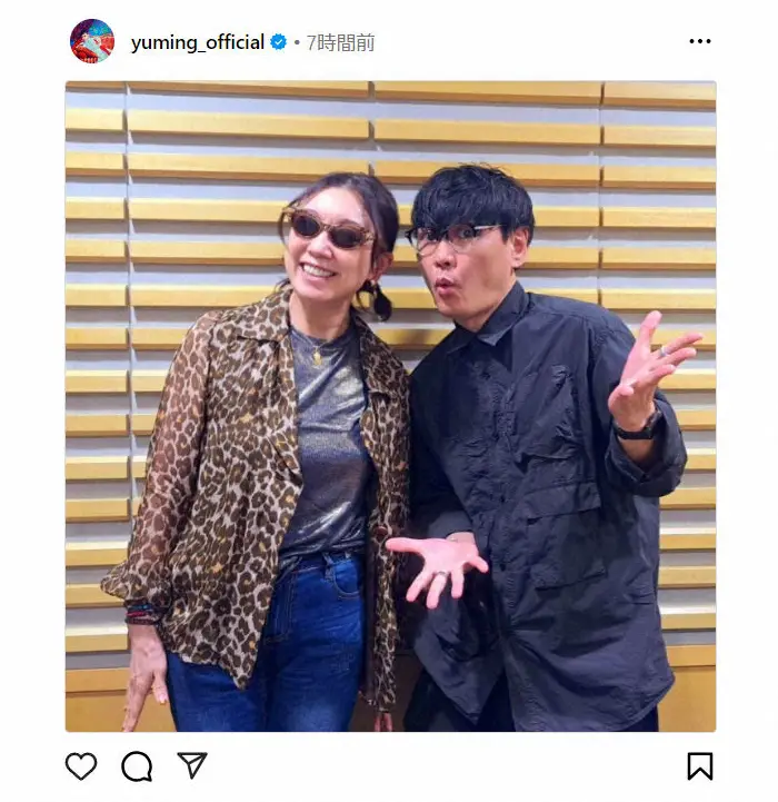 シンガー・ソングライターの松任谷由実(70)が21日、自身のインスタグラムを更新。5人組ロックバンド「サカナクション」のボーカル・山口一郎(44)との2ショットを披露した。
