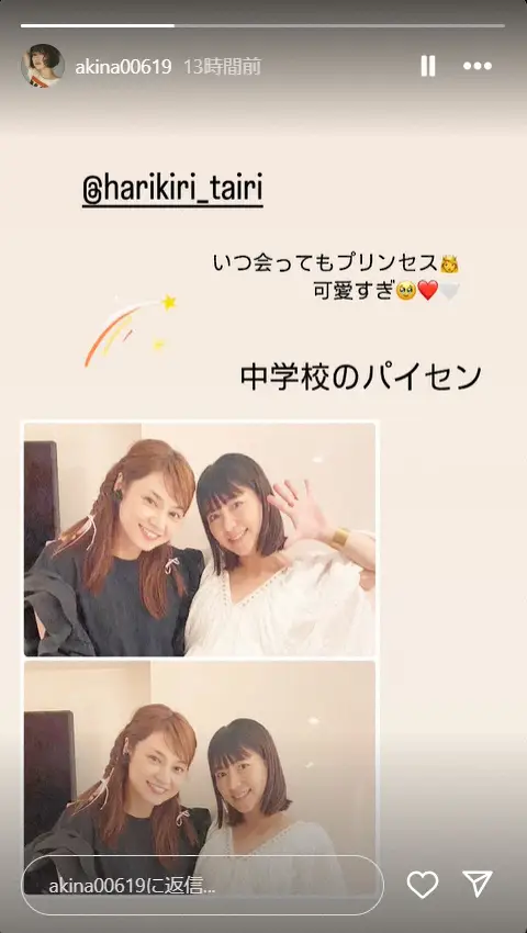 AKINAは「いつ会ってもプリンセス 可愛すぎ」とつづり、女優でタレントの平愛梨との写真をアップ。「中学校のパイセン」と明かした。