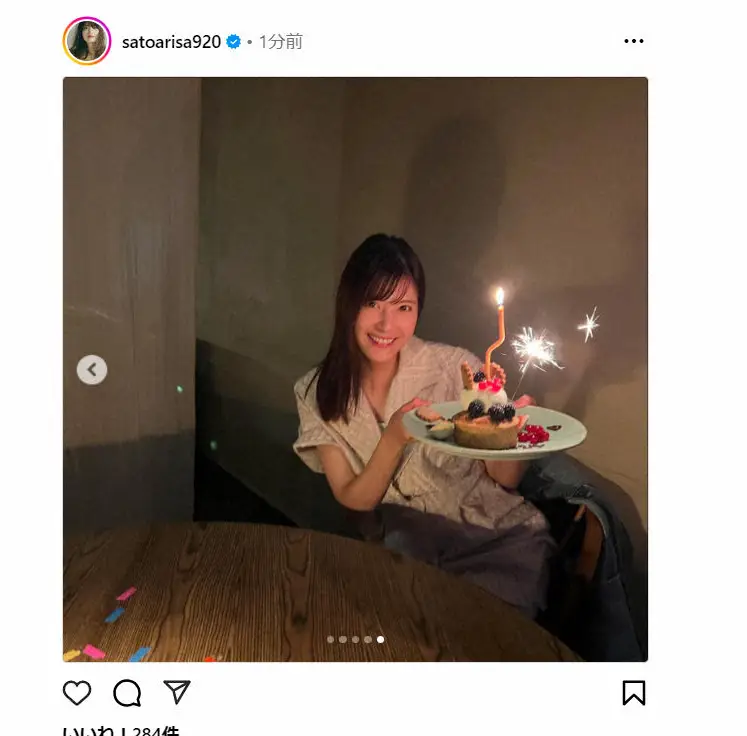 佐藤は「9月20日で36歳になりました」と書き出し、バースデーケーキを持つオフショットやプレゼントの花束の写真をアップ。