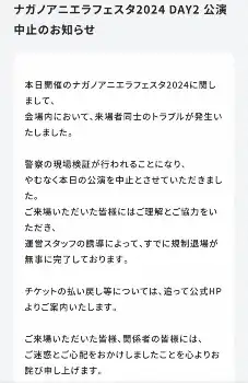 これを受け、同フェスの公式サイトでは「本日開催のナガノアニエラフェスタ2024に関しまして、会場内において、来場者同士のトラブルが発生いたしました」と報告。