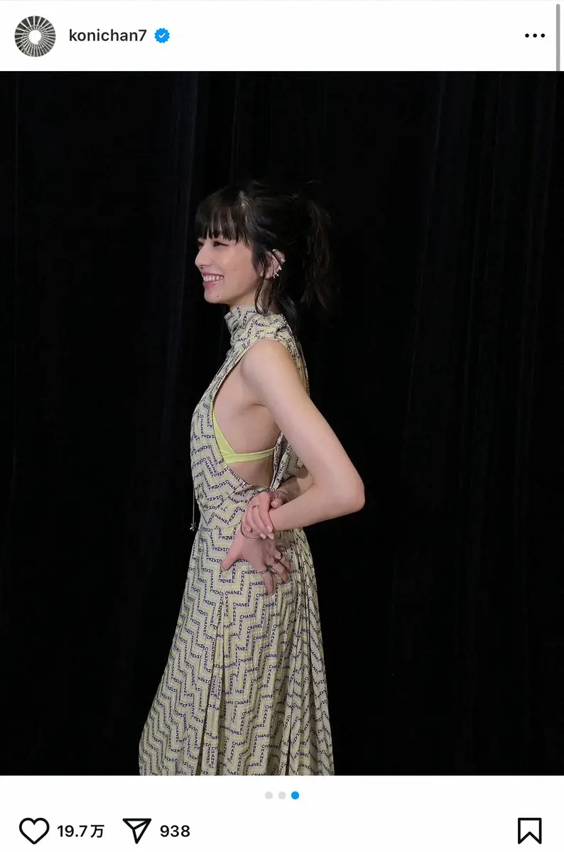 ネオンイエローのラインが目を引くドレスに身を包み、満面の笑みを浮かべた小松。産後とは思えないプロポーションを披露してファンを驚かせた。