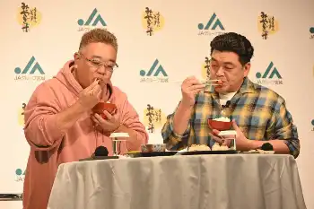 つやつやに輝く炊きたての宮城米に舌鼓を打った2人。「本当にうまい!食べないと分からない」と歓喜の声を上げていた。
