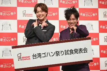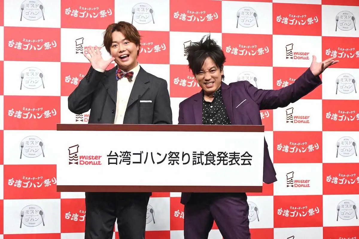 お笑いコンビ「ぺこば」のシュウペイ(37)、松陰寺太勇(40)が26日、都内で行われた「ミスタードーナツ台湾ご飯祭り試食発表会」に出席した。