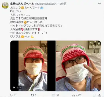 この日朝、「おはよう ちゃんでーす」と投稿。「昨日から入院してます」と報告。「先日CTで頭に形質細胞種発覚 放射線治療に入りました!」と明かした。