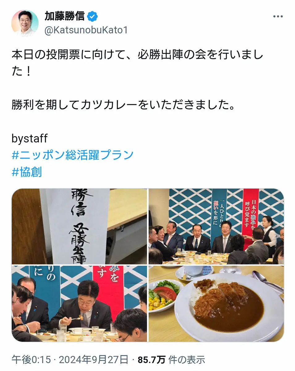 27日に加藤氏のXに「本日の投開票に向けて、必勝出陣の会を行いました!勝利を期してカツカレーをいただきました」とスタッフが投稿。支持する議員に囲まれてカツカレーを食べる加藤氏の画像などをアップしたが、SNS上には「最低6人が裏切り」「裏切り者が5人から6人に増えた」「裏切りは麻生派?安倍派?」などの声が上がっている。