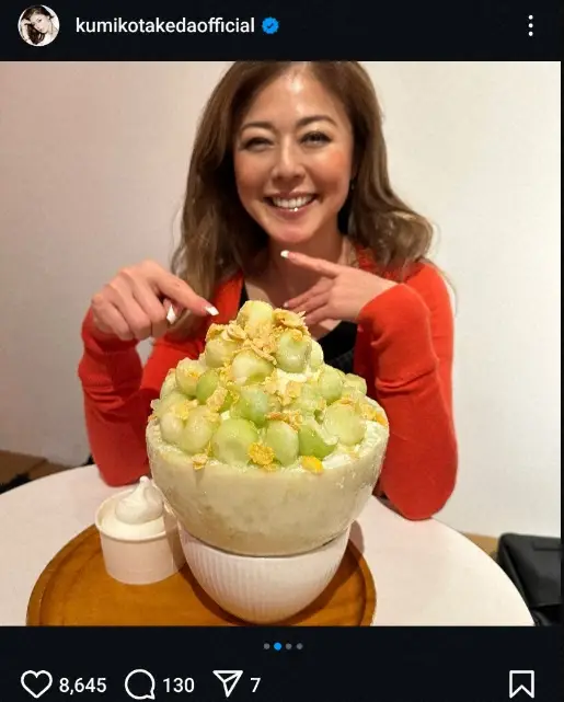 「美味しかったデザート 娘のお友達と3人で楽しくシェアーしてお腹いっぱい楽しみました」とつづり、特大メロンのかき氷を前に満面の笑みを浮かべているショットをアップ。