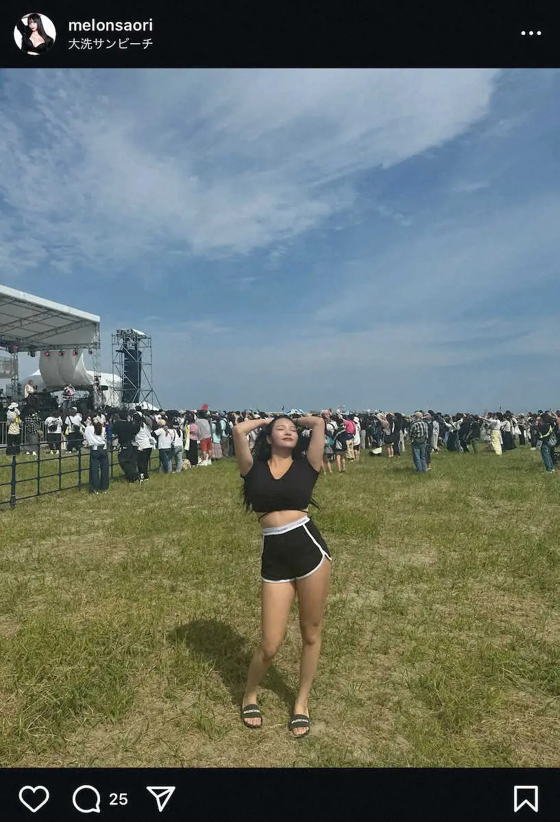 28日に行われた大洗海上花火大会に熱波師として出演したSAORI。自身のインスタグラムで「海辺の風が気持ちよすぎる」と青空の下で腹筋がチラリと見える黒のショートパンツ姿でポーズする写真を投稿した。