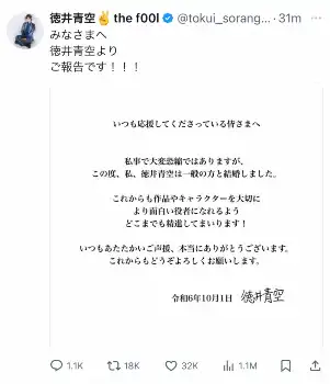 続けて「これからも作品やキャラクターを大切により面白い役者になれるようどこまでも精進してまいります!」と決意を新たにした。さらに「いつもあたたかいご声援、本当にありがとうございます。これからもどうぞよろしくお願いします。令和6年10月1日 徳井青空」と呼びかけた。