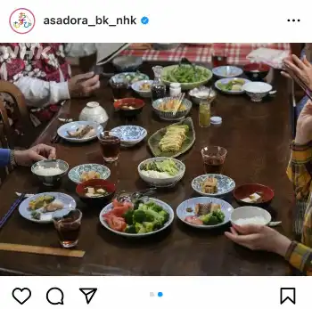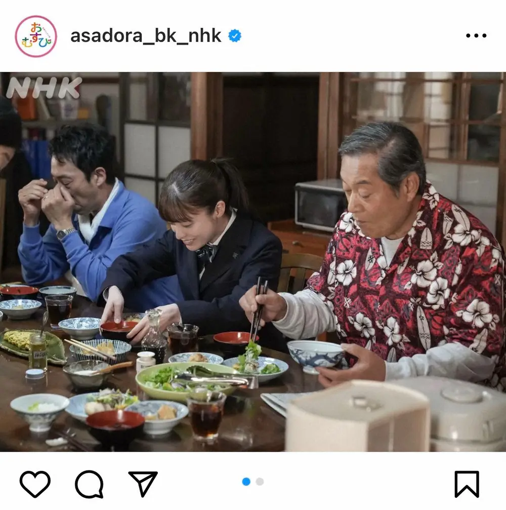同アカウントは「『食』が大きなテーマの朝ドラ、おむすびです」とコメントし、橋本や俳優・北村有起哉、松平健らが食事をする朝食シーンの様子や実際に撮影に使用された料理を公開。