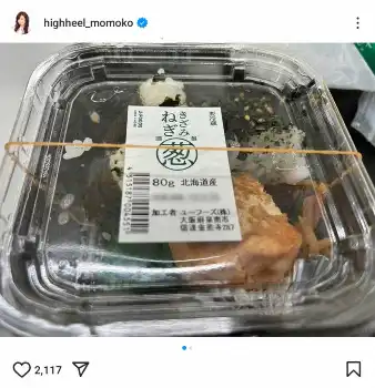 この日は「劇場やテレビ局によく簡単ご飯を持って行きます!」と報告。「ネギの入れもんにおにぎり、しゃけ、たまご 3分で食べてまう」と"弁当"の中身を解説し、「きざみねぎ」「80g」「北海道産」などと書かれたプラ容器の写真を公開した。