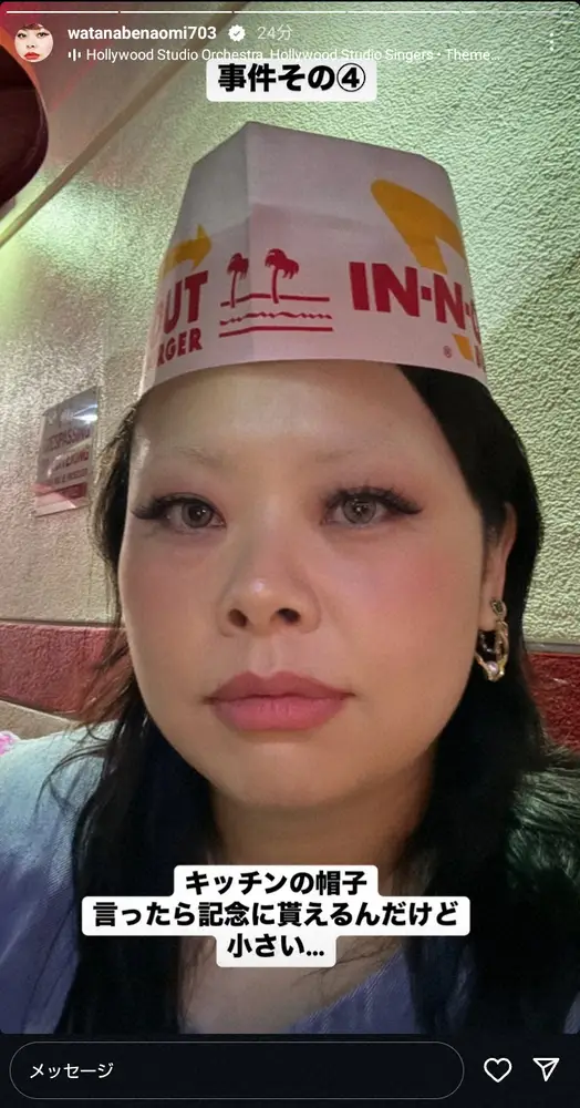 その後も「事件」として「昨日も行ったのに…」とハンバーガー店の写真を掲載。さらに「キッチンの帽子 言ったら記念に貰えるんだけど小さい…」とハンバーガー店の帽子を被った自身の姿を披露した。