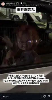 続く投稿で「事件起きた」と報告。「夜道に怯えてキョロキョロしてたら やべーやつ現れてみんなで叫んだwww なんのためにこのステッカー貼ってんの?ww まじでLA大先生怖すぎます」と、窓ガラスにホラー映画のキャラクターが貼られた車の写真を公開した。