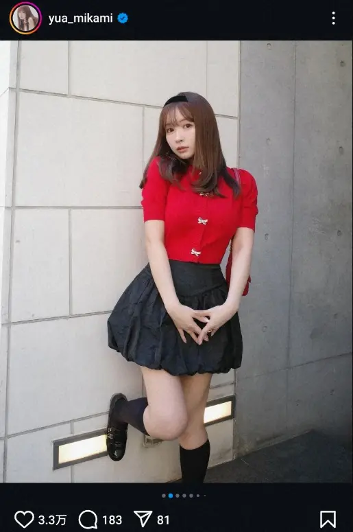 SKE48の元メンバーでタレントの三上悠亜(31)が2日までに自身のインスタグラムを更新。赤ニット&黒バルーンミニスカート姿を披露した。