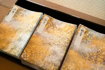 5枚ほどの料紙を仮綴じ。それらに針で赤い紐を通し、ひとまとめ。余白の部分を切り落とし、金箔や銀箔などをあしらった表紙を加える。最後に「題簽(だいせん)」という巻の題名を記した紙片を貼り、完成となる。