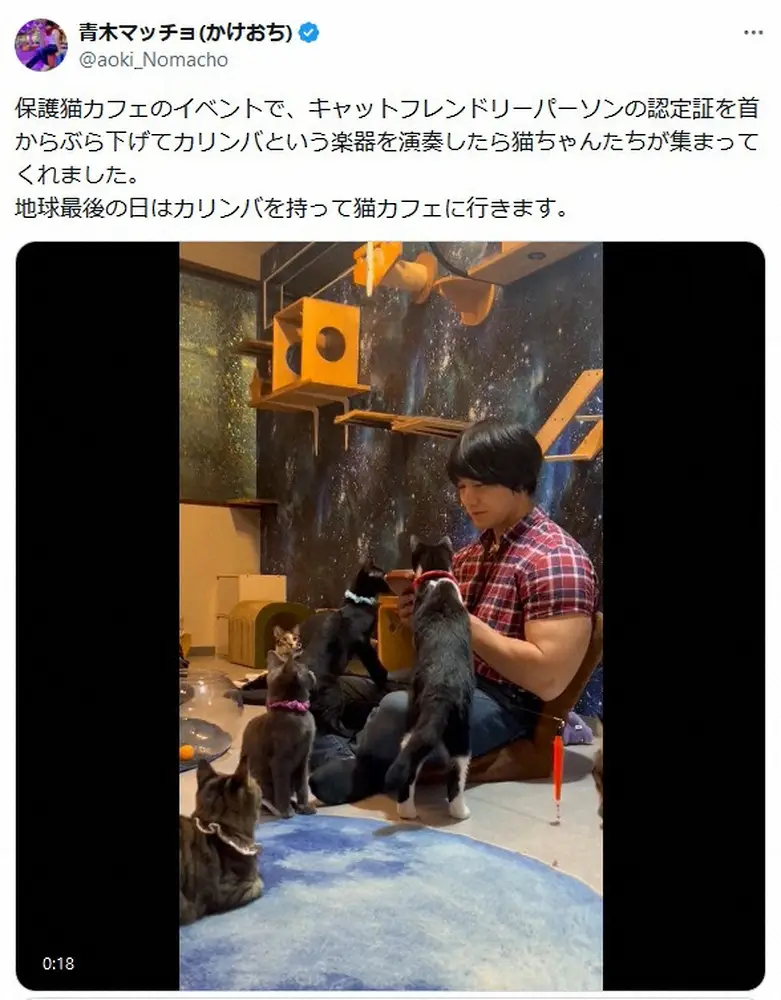 そして「地球最後の日はカリンバを持って猫カフェに行きます」と“宣言”。アフリカの民族楽器・カリンバを演奏する青木のもとに、続々と猫が集まる様子を動画で公開した。