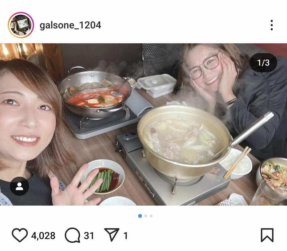 「久しぶりに三宅ちゃんとランチ」と書き出すと、大きな鍋2つなど韓国料理が並ぶ机を挟む三宅さんと自身のショットをアップ。