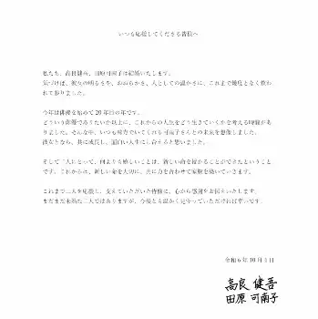この日、高良は報道陣にあてたFAXで「いつも応援してくださる皆様へ 私たち、高良健吾、田原可南子は結婚いたします。気づけば、彼女の明るさや、おおらかさ、人としての温かさに、これまで幾度となく救われて参りました。今年は俳優を始めて20年目の年です。どういう俳優でありたいか以上に、これからの人生をどう生きていくかを考える時間がありました。そんな中、いつも味方でいてくれる可南子さんとの未来を想像しました。彼女となら、共に成長し、面白い人生にし合えると思いました」と報告。「そして二人にとって、何よりも嬉しいことは、新しい命を授かることができたということです」と伝えた。