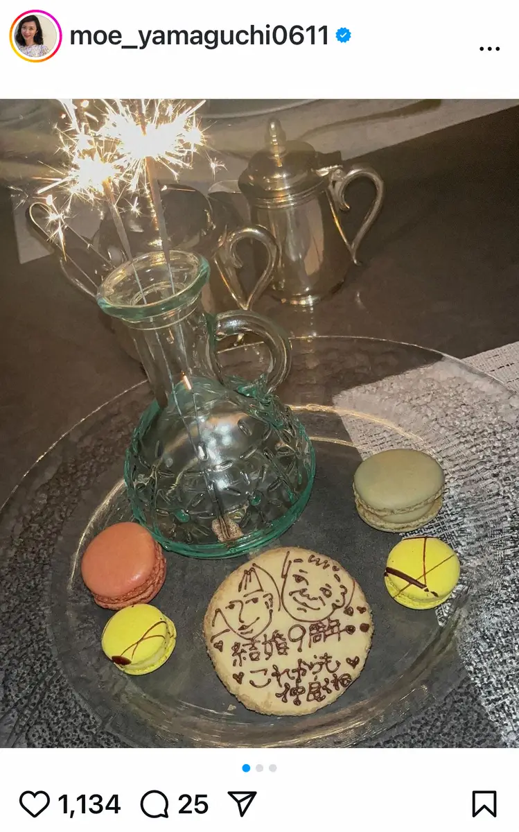 「こちらこそよろしくね」とお祝いのプレートや花束の写真を投稿。「#結婚」「#結婚記念日」「#9周年」とし、田中との結婚生活が9周年目を迎えたことを明かした。