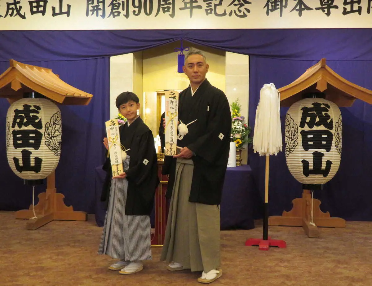 「成田屋」ゆかりの大阪成田山から同劇場に御本尊がまつられ、2人は出開帳開白法要にも出席。團十郎は「成田山のお不動さまが、こうやって劇場に出てきてくださる。大変ありがたい。市川團十郎家の信念というものを、もう一度考え直して明日からの初日に挑みたい」と表情を引き締めた。