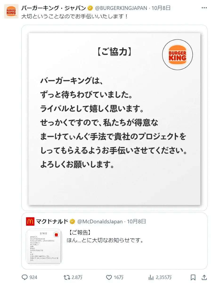 バーガーキングの公式X(旧ツイッター)が9日までに更新され、その投稿に注目が集まっている。マクドナルドの公式Xの投稿を引用し、“縦読み”でメッセージを送り、20年の2店のやりとりも思い起こさせた。