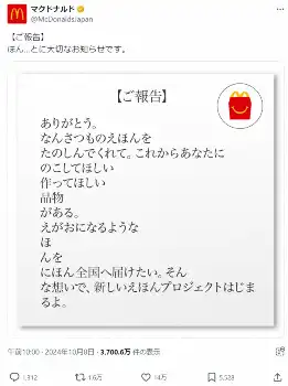 マクドナルドのXは「ほん…とに大切なお知らせです」とつづり、メッセージ画像を投稿。新しく始まる絵本のプロジェクトを知らせるもので、“縦読み”すると「あなたの作品がえほんになる」とメッセージを浮かび上がらせた。
