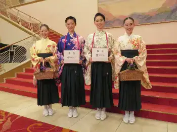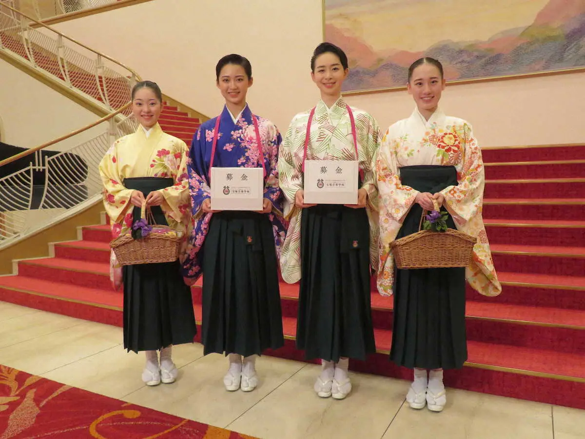 1年目の予科40人、2年目の本科生40人、計80人が緑のはかまにそれぞれ華やかな小振り袖を合わせ、訪れたファンに声掛け。「がんと闘う子どもたちのためにご支援ご協力をお願いいたします」「当たり前の生活をあきらめることのないように、ご協力よろしくお願いいたします」と募金への協力を呼びかけた。