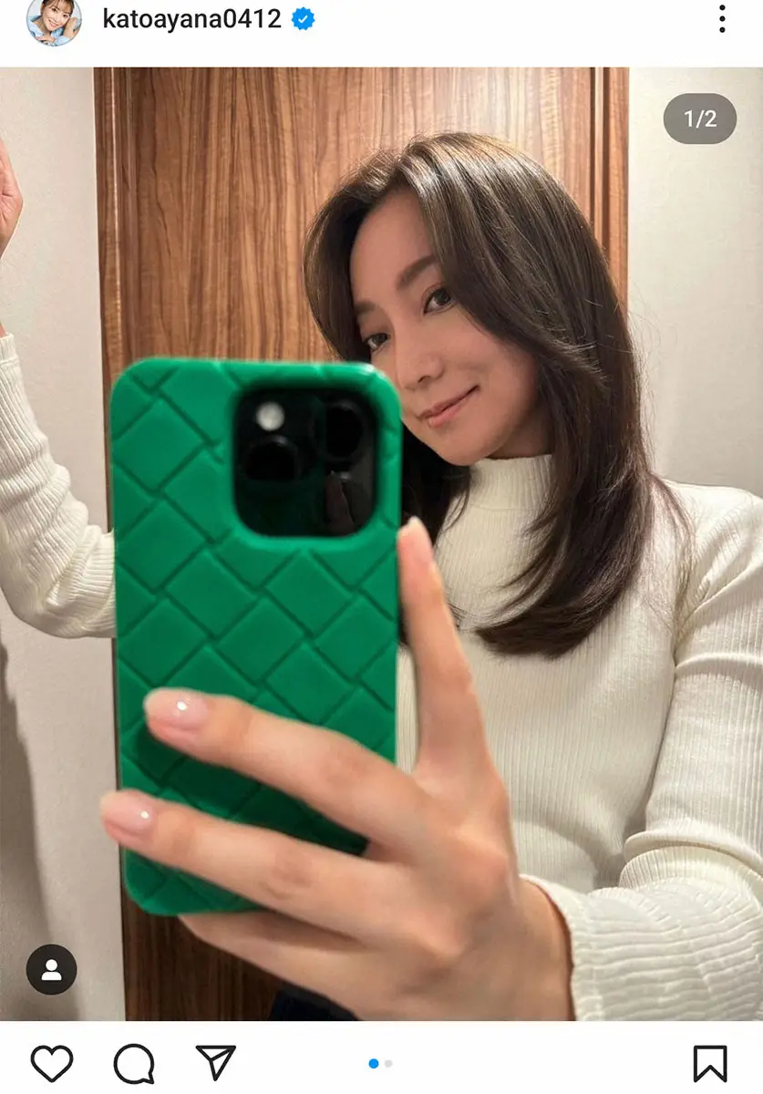 綾菜は「グレージュベースに新色のルーシッドグリーン」を入れた落ち着いた髪色のニューヘアを披露し「秋だし一気に髪色暗くしたよ」と報告。「カラー変えるだけで一気に肌が白く見える カトちゃんに『いいね~』と褒められた 嬉しいー」とつづった。