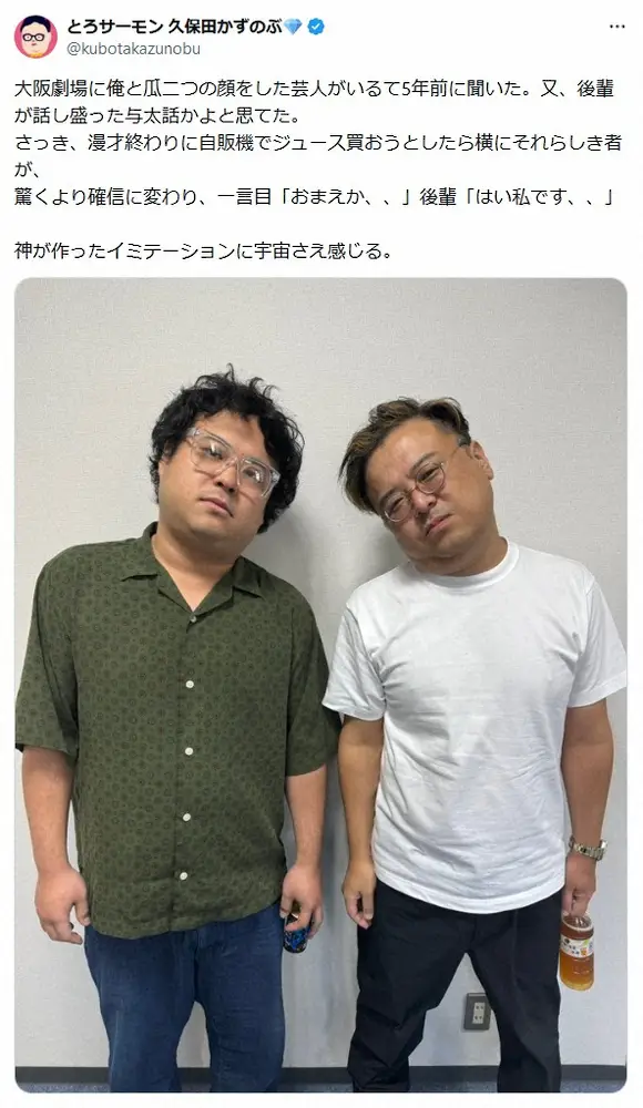 久保田は「大阪劇場に俺と瓜二つの顔をした芸人がいるて5年前に聞いた。又、後輩が話し盛った与太話かよと思てた」と投稿した。