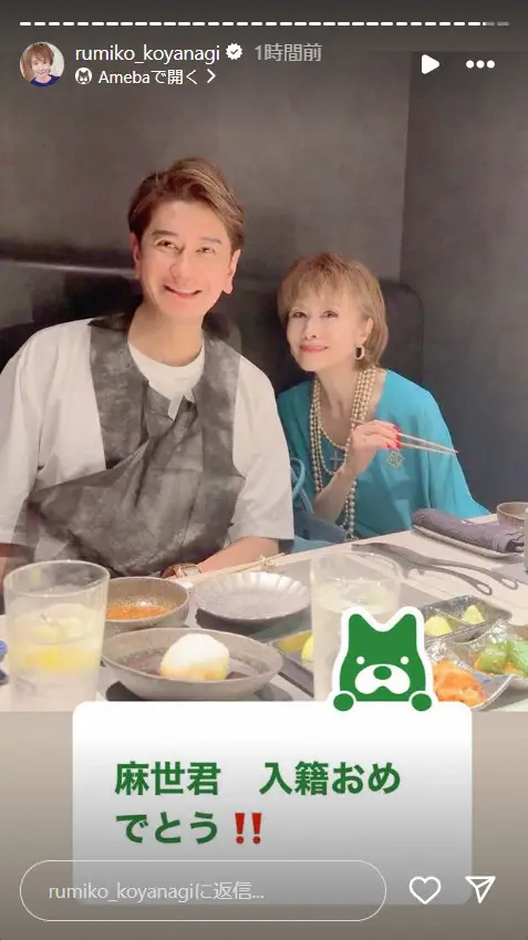小柳は「麻世君が 入籍しましたー !!」とつづり、川崎との2ショットをアップ。「麻世くーん!!入籍おめでとうー 水くさいじゃないのぉー お姉さんに報告がないなんて」と、冗談を交えて喜びを表した。