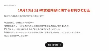 同局は「10月13日(日)の放送内容に関するお詫びと訂正」を発表し、「『名古屋めし』を特集したVTRの中で、『若鯱家』のカレーうどんのとろみが小麦粉由来である旨の表現がありましたが、正しくは、カレー粉に含まれるスパイス由来の成分によるものでした。『若鯱家』ではカレーうどんのとろみ付けのために小麦粉を入れるということはしておりません」と訂正。「訂正してお詫び申し上げます」と呼びかけた。