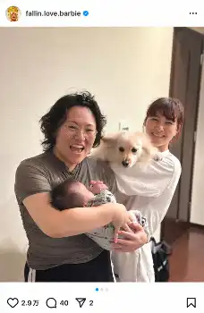 お笑いコンビ「フォーリンラブ」のバービー(40)が16日までに自身のインスタグラムを更新。プロフィギュアスケーターでタレントの村上佳菜子(29)が自宅に遊びに来たことを報告し、長女と愛犬との4ショットを公開した。