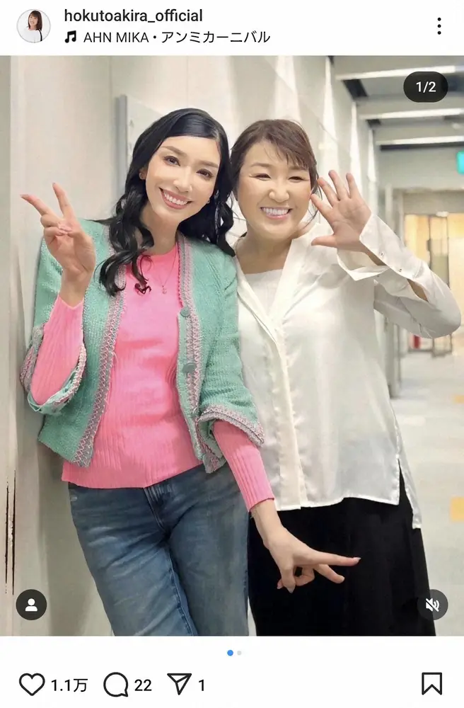「いつもご飯の約束をしてるんだけど中々スケジュールも合わずで 2人で近々、おめでたい事があるお友達へのプレゼントを考え中」とつづると、「本当にミカちゃんに会うと元気になる なんというか、人を元気にする何かを持ってる人っているよね~!!元気を有難うねーミカちゃん」と記した。ハッシュタグでは「アン・ミカ」「偶然」「楽屋」「元気いっぱい」「元気をくれる人」と添えた。