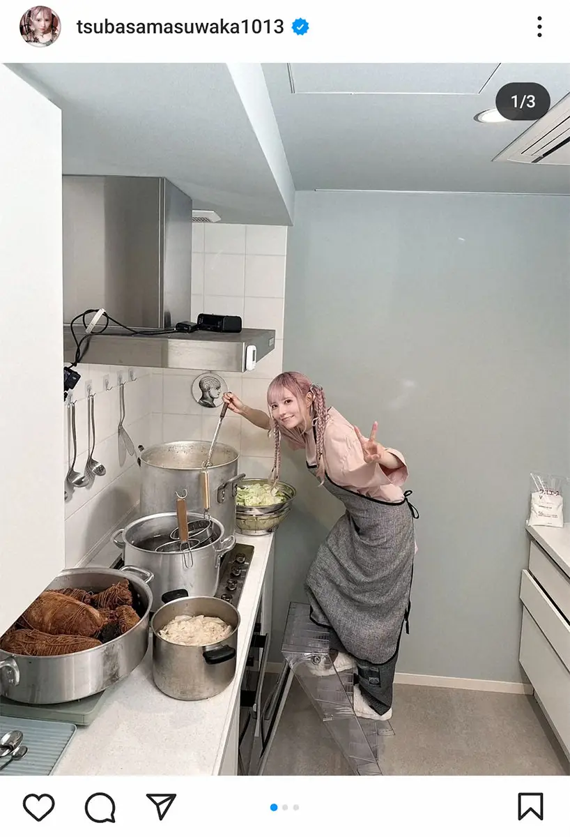 益若は鍋にたっぷりのチャーシュー、大きなずんどう鍋で作るスープなど脚立に上りながら作るキッチンの様子を披露し「プライベートで作っている二郎系ラーメン(つば二郎)がとうとうテレビにバレました」とし「あはは。骨から作るよ。ラーメン好き集まれ!ぜひ観てね」と、この日放送のTBS系「櫻井・有吉THE夜会」の告知もした。