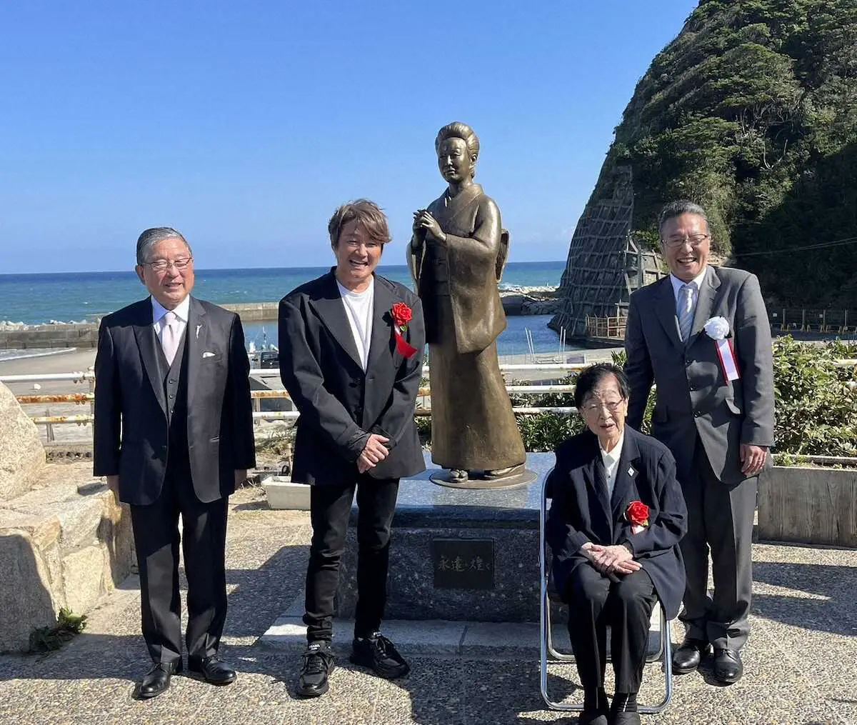 美空ひばりさん像とともに写真に納まる(左から)徳光和夫、近藤真彦、石井ふくこ、加藤和也さん