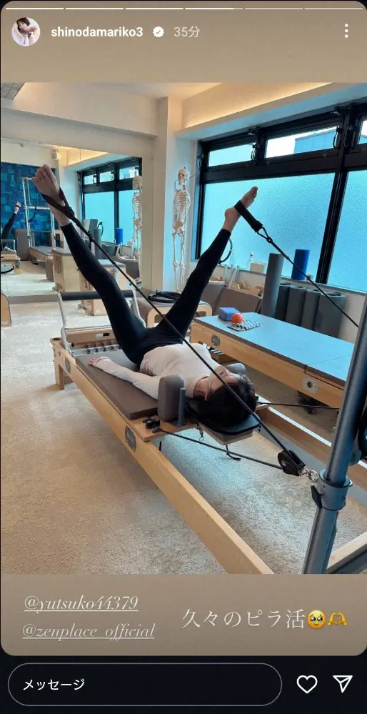「久々のピラ活」「健康第一 背筋強化の地味にキツイ朝」とつづり、白のトップスに黒のレギンス姿で、マシンピラティスに励んでいる写真をアップした。