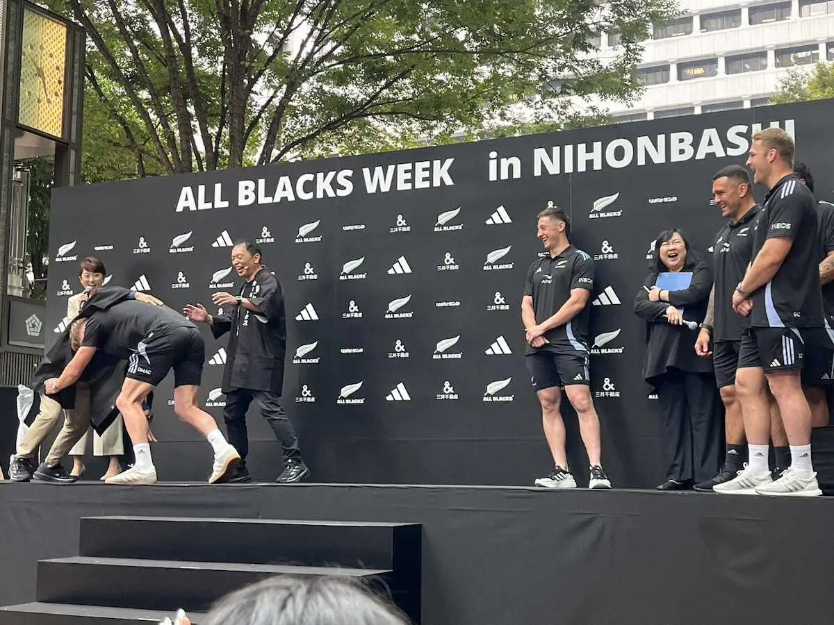 お笑いコンビ「中川家」の剛(53)と礼二(52)が18日、都内で行われた「オールブラックスウィーク開幕セレモニー」に登場した。ラグビー・ニュージーランド代表「オールブラックス」の来日に合わせて行われたイベントで、中川家は選手らとともに登壇した。